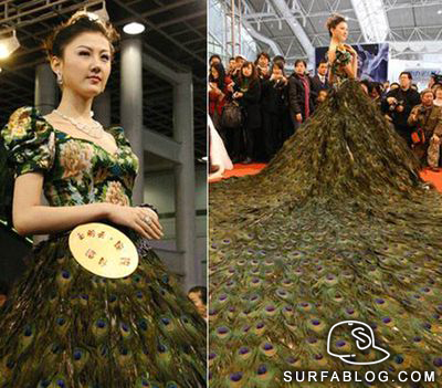 Questo vestito è stato presentato alla fiera degli abiti da sposa in Cina. E' composto da oltre 2000 piume di pavone unite tra di loro. Costa 1,5 milioni di dollari e ci sono voluti 8 mesi per farlo.