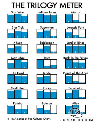 Eccovi tutte le trilogie più importanti della storia del cinema. Il celeste è l'indice di gradimento del pubblico! Concordo con tutte!