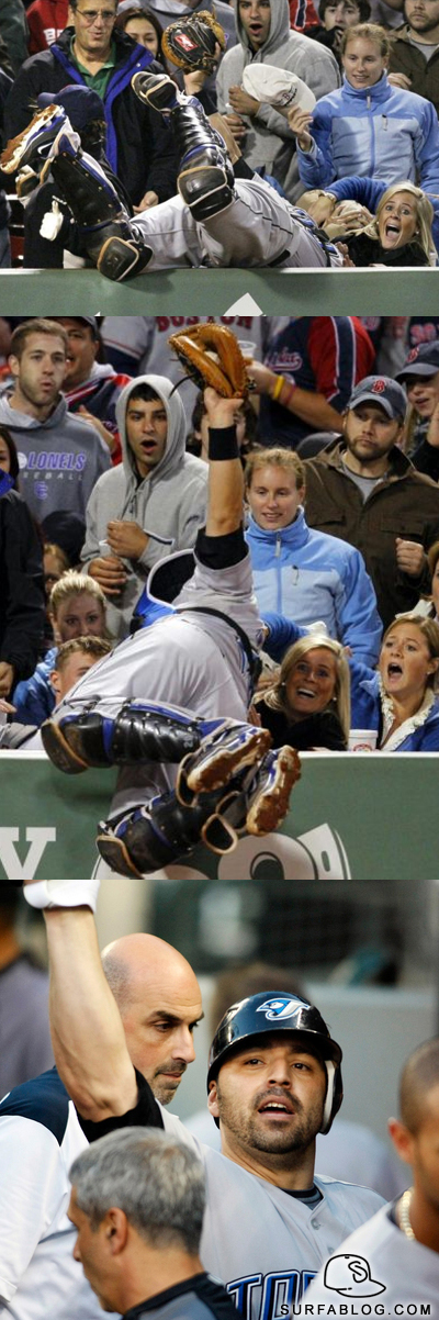 Rod Barajas, ricevitore messicano dei Toronto Blue Jays (per saperne di più clicca qui), si è reso protagonista di una presa spettacolare nel corso della sfida del campionato americano di baseball contro i Boston Red Sox. Barajas è volato sugli spalti, tra lo stupore e la paura degli spettatori, ma alla fine è riuscito a salvare la pallina facendo tornare il sorriso sui volti dei tifosi.