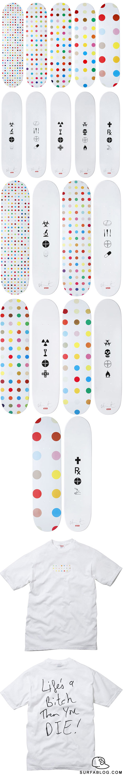 Damien Hirst in collaborazione con Supreme realizza queste tavole da skate. Verranno messe in vendita negli store dei brands dal 23 Novembre. Lo slogan di questa collaborazione è "La vita è una tro*a e dopo MUORI".