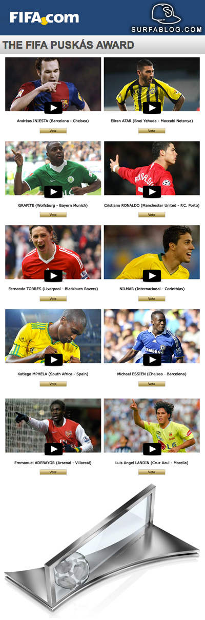 Il FIFA Puskas Award decreta il gol più significante e spettacolare dell'anno. Nato nel 2009, il nome è in onore a Ferenc Puskas, capitano della nazionale ungherese morto nel 2006; il giocatore militava nel Real Madrid ed è stato il maggior capocannoniere del 20esimo secolo con 512 gol in 528 partite. Vincerà chi prenderà più voti. Si potrà votare fino al 29 Novembre e verrà dichiarato il vincitore il 9 Gennaio 2009. Qui di seguito i 10 finalisti del 2009: