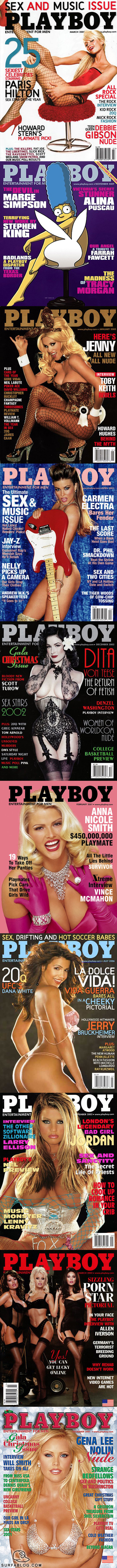clicca qui) eccovi l'ultima top 10 decennale. Nelle covers che vanno dal 2000 ad oggi, trionfa la ragazza rifatta, dei sex tape e del gossip! Tutte sono famosissime e note o per i loro fidanzamenti o per la loro vita sregolata. Al primo posto Marzo 2005 con Paris Hilton. Qui di seguito la top 10 degli ultimi 10 anni.