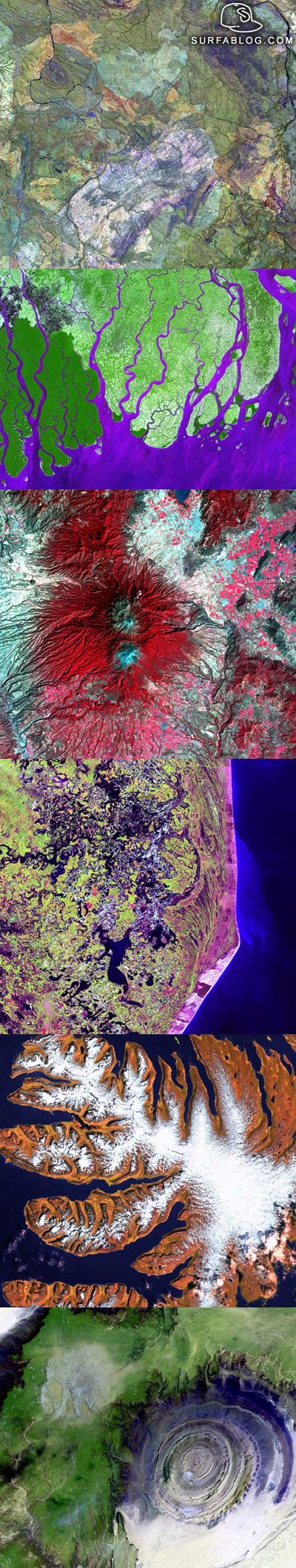 Landsat 7: non è un vero e proprio fotografo, non è un essere umano, ma è un satellite che scatta foto della terra dallo spazio. Prospettive uniche e colori vividi grazie alle 8 bande spettrali del programma Landsat che, gestito dalla Nasa, osserva dal 1972 la terra per motivi non militari attraverso i satelliti. Landsat 7 può catturare e trasmettere fino a 532 immagini al giorno. Nell'immagine partendo dall'alto: Grande Deserto Sabbioso (Australia), Delta del fiume Gange (India), Vulcano Colima (Messico), Capo Sant'Antonio (Argentina), Fiordi (Norvegia), Struttura di Richat (Mauritania).