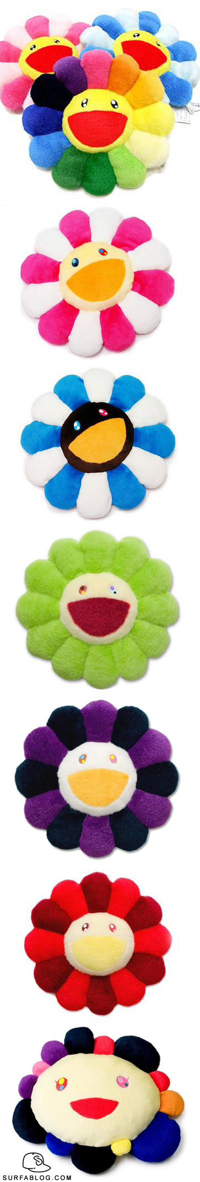 Kaikai Kiki By Takashi Murakami: Flower Cushions. In occasione dell'uscita dell'ultimo modello di questi famosi cuscini, dedico un post a tutti quelli prodotti dall'artista. Nell'immagine sono in ordine dal primo all'ultimo realizzato. I prezzi variano dai 107 ai 220 $.