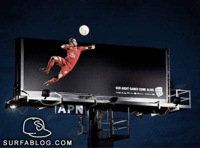 Jam Adelaide ha realizzato questo billboard per l'Adelaide United Football Club per promuovere le partite notturne nei posticipi. L'idea è stata di rappresentare un calciatore che colpisce non un pallone ma la Luna.
