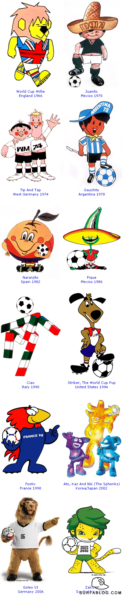 Ieri vi avevo parlato di Zakumi, la mascotte di Sudafrica 2010 (per saperne di più clicca qui). Oggi eccovi la lista di tutte le mascotte. Ogni Coppa sel Mondo FIFA ha dal 1966 la sua mascotte. World Cup Willie del 1966 è stata la prima per i Mondiali di Calcio ed una delle prime in assoluto per una competizione sportiva di grande portata. Di solito le mascotte rappresentano una caratteristica (costumi, flora, fauna ecc.) del paese ospitante. Sono in gran parte destinate ai bambini con cartoni animati e altro merchandising.