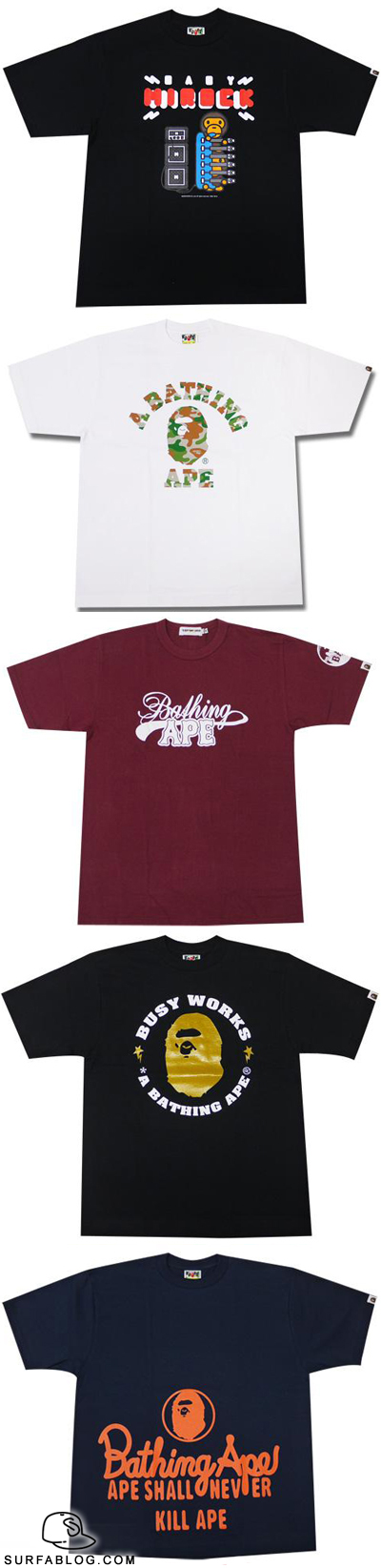 Nuove grafiche per Bape! Eccovi gli ultimi modelli realizzati per l'Estate 2010. In ordine: Bape MiRock Tee, College Puzzle Camo, Champion Logo, BS Circle Busy Works e Bape Team Heavy.