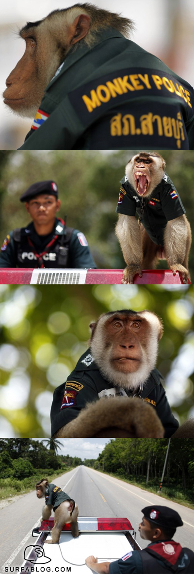 Si chiama Santisuk, che in thailandese vuol dire "pace". E' un macaco di 5 anni, ormai parte integrante della polizia del distretto di Saiburi. Santisuk è stato trovato ferito da un agente, che l'ha adottato e ha iniziato a portarlo con sé in pattuglia. Le autorità hanno scoperto che la presenza della scimmia migliora l'atteggiamento della popolazione nei confronti della polizia, e hanno deciso di dotarla di una divisa su misura.