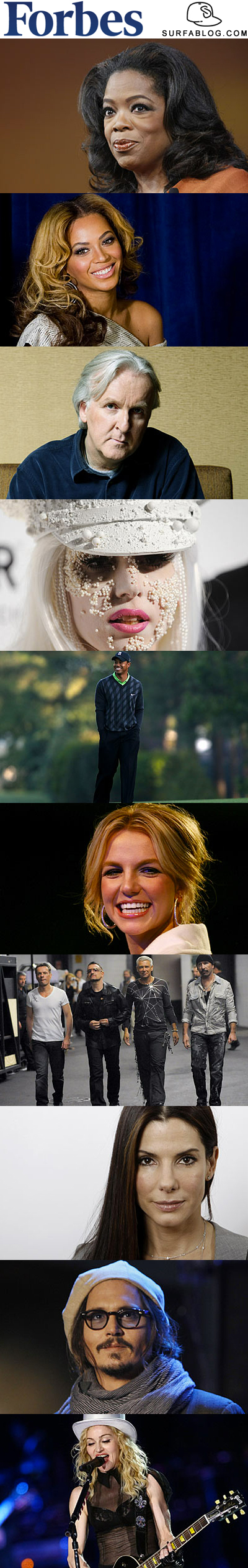 Forbes Magazine ha stilato la classifica con le 10 celebrità più potenti del Pianeta. Nel 2010 al primo posto c'è Oprah Winfrey. La sua prima posizione è dovuta: ai 315 milioni di dollari guadagnati con il suo show e per la sua forte influenza nel mondo delle comunicazioni. Qui di seguito la top 10: