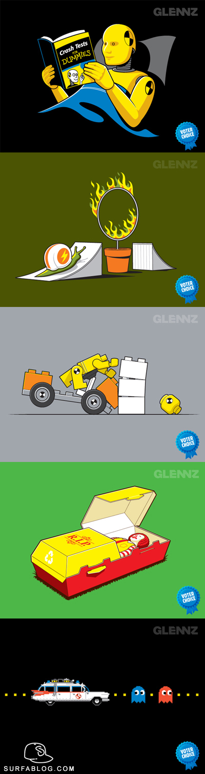 Nuovo post dedicato a Glenn Jones, un grafico geniale che realizza t-shirts. I nomi delle 5 immagini di oggi sono: "For Dummies", "Stunt Snail", "Crash Test", "Fast Funeral", "Called For Help".