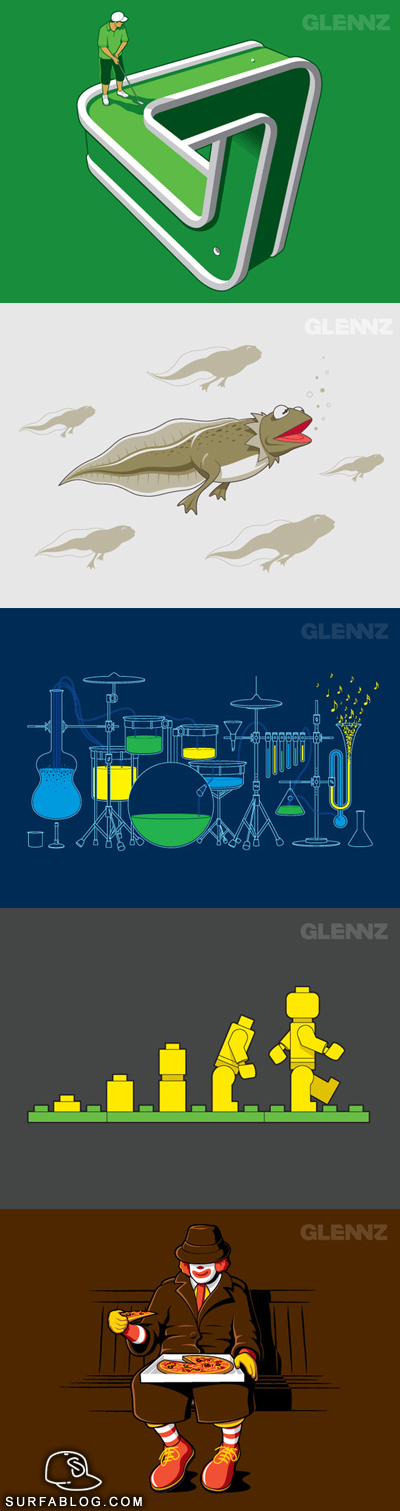 Nuovo post dedicato a Glenn Jones, un grafico geniale che realizza t-shirts. I nomi delle 5 immagini di oggi sono: "Puzzled Putter", "Before Stardom", "Experimental Music", "Evolution", "Secret Habit".