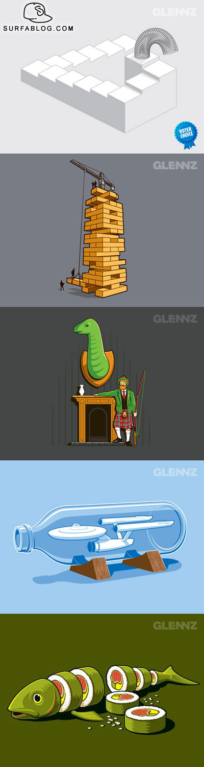 Nuovo post dedicato a Glenn Jones, un grafico geniale che realizza t-shirts. I nomi delle 5 immagini di oggi sono: "Slinky Heaven", "Risky Engineering", "Prize Catch", "It's A Bottle Jim", "Endangered Species".