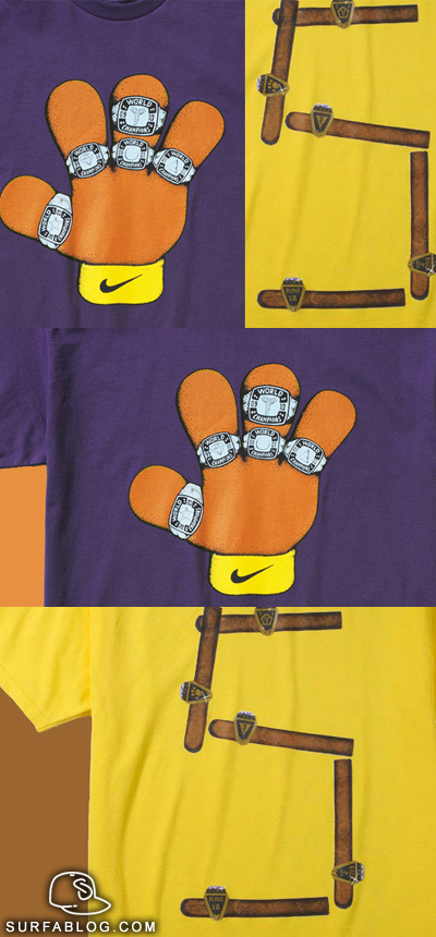La Nike Basketball ha voluto celebrare il recente successo dei Lakers con 2 t-shirts per il suo testimonial Kobe Bryant. Le maglie sono chiamate "5 Ring Puppet" e "5 Cigars". Nice!