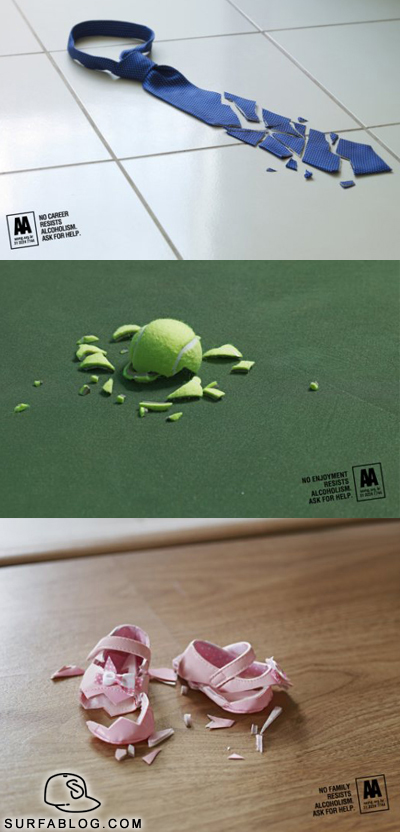 Sono 3 pubblicità per promuovere gli alcolisti anonimi. Lo slogan è "nessuna carriera, atleta, famiglia resistono all'alcolismo. Chiedi un aiuto".