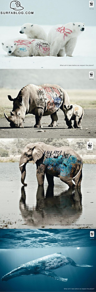 La WWF ha realizzato 4 spot, rispettivamente ognuno con, orsi polari, rinoceronti, elefante e balena. In queste pubblicità gli animali appaiono con graffiti e tags sul loro corpo. Lo slogan è "Che cosa deve accadere, perchè noi rispettiamo il pianeta?" A realizzarla Chris Garbutt.