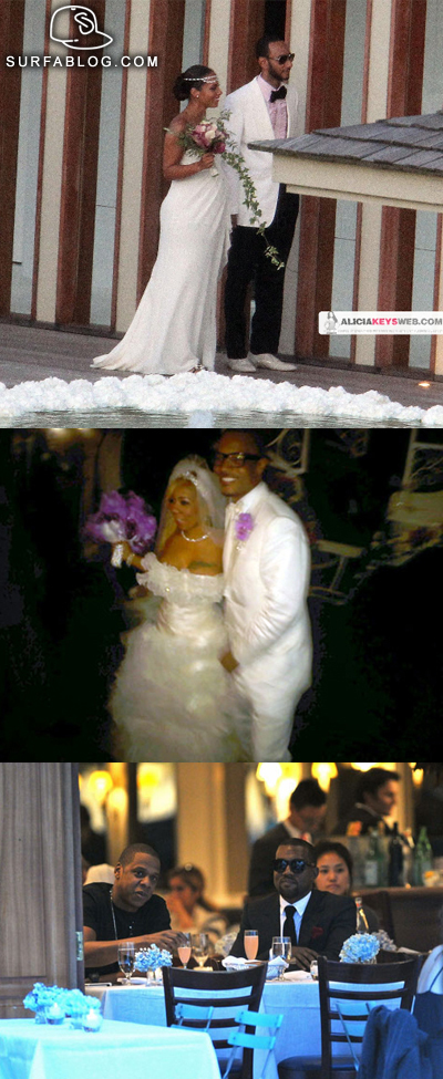 Nuove accoppiate di VIP oggi! Nella prima foto: Swizz Beatz & Alicia Keys che si sono sposati in gran segreto a Pinatarella, in Corsica. Nella seconda un altro matrimonio: T.I. & Tiny che si sono scambiati le fedi a Miami. Per concludere: Jay-Z & Kanye West mentre pranzano al ristorante Niello a New York.