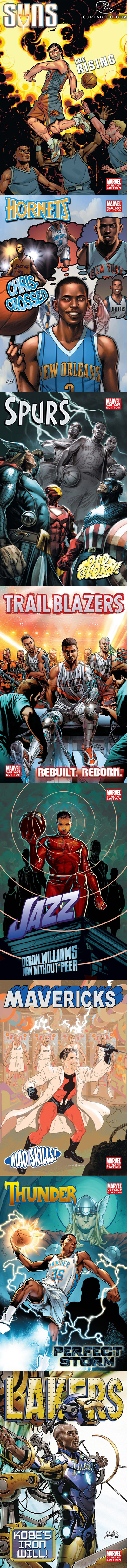 La Marvel Comics ha offerto i propri autori per presentare i protagonisti della nuova stagione NBA sulle pagine del numero di Novembre del magazine ESPN! Le stelle del basket incrociano così i loro poteri straordinari con le magie dei supereroi più celebri del Marvel Universe. I giocatori più rappresentativi di ogni squadra vestono i panni degli eroi Marvel. Stupendo!