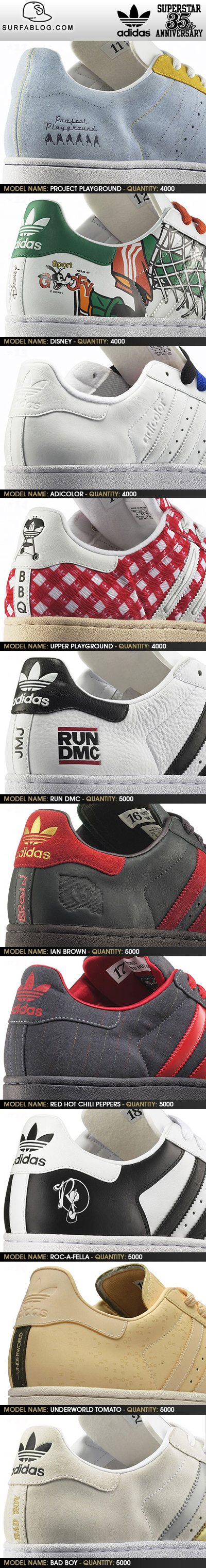 Adidas SuperStar 35th Anniversary. La super collezione realizzata nel 2005 con 35 modelli diversi (limitati e non) di Adidas SuperStar. Eccovi oggi il secondo di 4 post! 10 modelli con relativo nome e quantità. Per vedere il primo