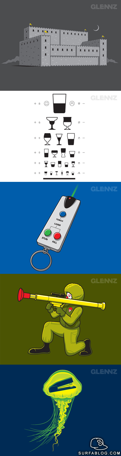 Nuovo post dedicato a Glenn Jones, un grafico geniale che realizza t-shirts. I nomi delle 5 immagini di oggi sono: "Le Fortress De Sofa", "Scientific", "Keyring", "Clown Wars", "Oceanic Oddity".