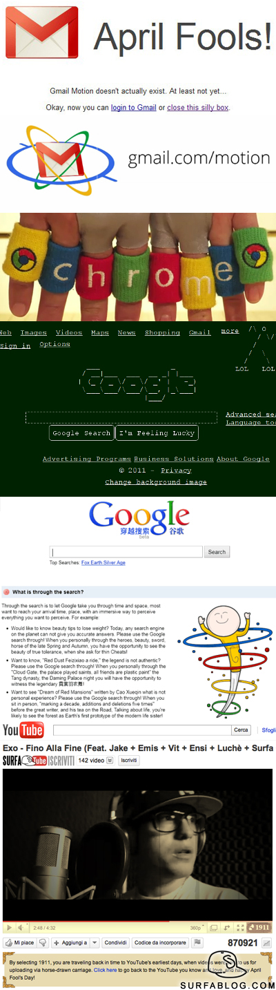 Ieri in occasione del primo Aprile, Google ha fatto numerosi pesci d'Aprile. Ha presentato GMail Motion, in versione beta per controllare la mail con gesti e movimenti davanti alla webcam, senza dover usare la tastiera (è il primo video sotto l'immagine). Ha pubblicato Chromercise: una guida web con una serie di esercizi per le dita per migliorare la muscolatura e la destrezza, migliorando l'esperienza nella navigazione dei siti (è il secondo video sotto l'immagine). ChromeLite: un'estensione che mostra il web così com'è stato concepito in orgine con pagine di solo testo. Google China ha lanciato Google Teleport, ovvero il metodo per potersi teletrasportare. E per concludere Youtube aveva scelto un look retrò in cui i video venivano mostrati come nel 1911. L'effetto si può vedere aggiungendo all'indirizzo di un video il suffisso "&vintage=1911".