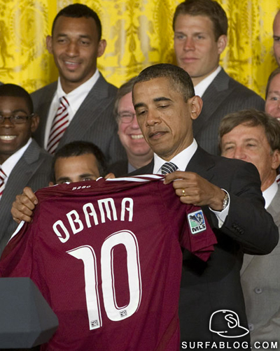 Barack Obama ha ospitato alla Casa Bianca i Colorado Rapids, campioni dell'MLS (il campionato di calcio Statunitense). Il presidente si è complimentato con i vincitori del titolo e al termine della conferenza ha ricevuto una maglia del club come regalo. Sul retro c'è scritto Obama 10 (il numero del leader della squadra). E il presidente ha commentato "Certo sono come Messi del Barcellona, siamo a quei livelli!"