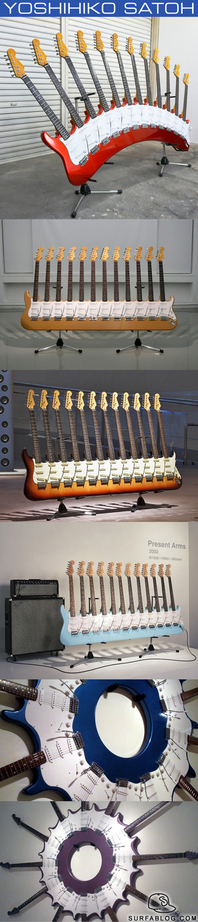 Yoshihiko Satoh è un designer e artista giapponese, capace di creare sculture composte da 12 chitarre insieme. Tutte sono collegate ad un amplificatore e alzando il volume al massimo, il suono sarebbe 12 volte più alto del normale.