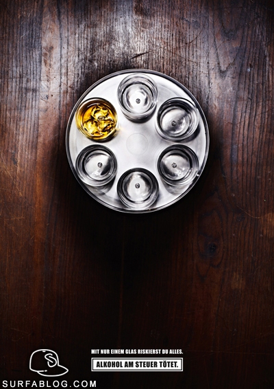 Lo slogan è "Con un solo bicchiere rischi tutto. Non bere e guidare". Eccovi il geniale spot dell'azienda Austriaca Lowe GGK Viene contro il bere e il guidare. L'ideatore è Thomas Tatzi che ha ricreato una roulette russa: il caricatore della pistola è in realtà un vassoio visto dall'alto con 6 bicchieri (che sembrano dei proiettili della pistola), 1 pieno e gli altri vuoti.