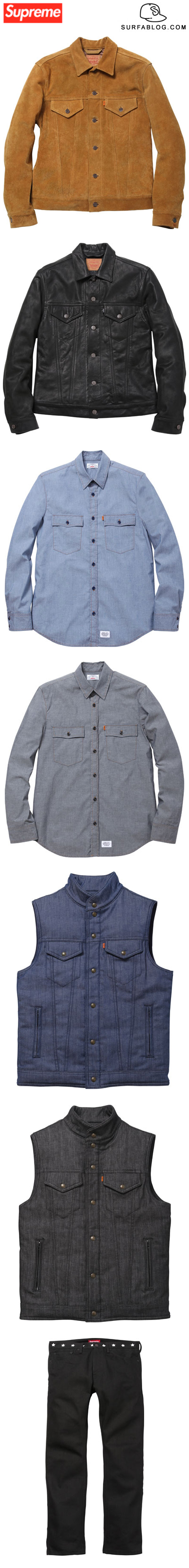 Supreme ha collaborato con Levi’s per questa collezione. La capsule è composta da Levi’s 505 Zip-Fly Jean, Chambray Work Shirt, Trucker Jacket in pelle ed in denim, Denim Down Vest e Denim Bell Hat. Tutti i prodotti sono realizzati negli USA.