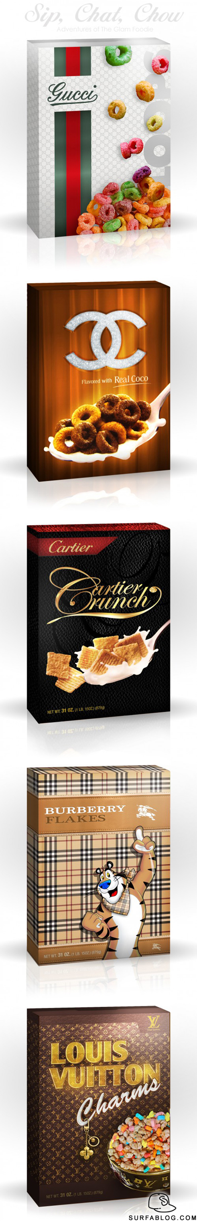 Sip, Chat, Chow hanno presentato i "Cereal Couture", ovvero le confezioni dei cereali in versione alta moda. In ordine: Gucci Loops, Coco Chanel, Cartier Crunch, Burberry Flakes e Louis Vuitton Charms.