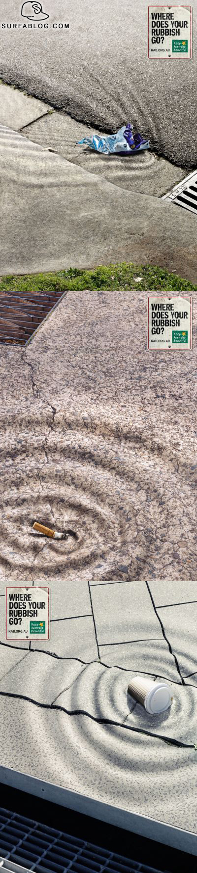 L'associazione "Keep Australia Beautiful" ha realizzato questi 3 spot con lo slogan "Where does your rubbish go?" (Dove credi che finisca la tua spazzatura?) con i marciapiedi che assumono la forme del mare, per indicare che tutti i nostri rifiuti finiranno lì. L'idea è di Paul Nagy e Mike Spirkovski.