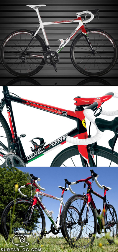 Eccovi le immagini della bicicletta della Ferrari. La CF8 è stata realizzata dalla Colnago ed è in gran parte costituita da fibra di carbonio. Usata da Alonso durante i suoi allenamenti, la bici costa 14.400 € (come una Golf).