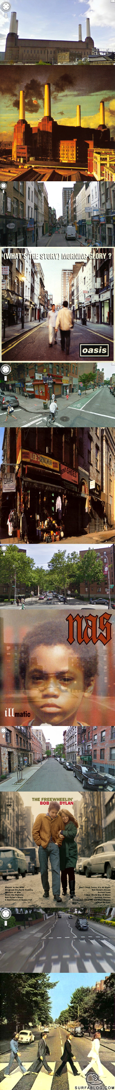 Grazie a Google Street View si possono visitare i luoghi di tutto il mondo stando a casa davanti ad un pc. E' quindi possibile rivedere i luoghi dove sono state realizzate le copertine di alcuni album storici. In ordine: Pink Floyd - Animals; Oasis - (What's The Story) Morning Glory?; Beastie Boys - Paul's Boutique; Nas - Illmatic; Bob Dylan - The Freewheelin'.