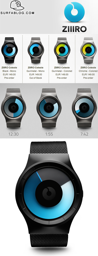 Ziiiro Celeste Watch. Ziiiro è una ditta che produce orologi super tecnologici con ottimo design e idee. Celesta Watch ha l'ora segnata sul quadrante con una scelta estetica vincente che sovrappone 2 dischi colorati creando la fusione degli stessi. Prezzo 149 €.