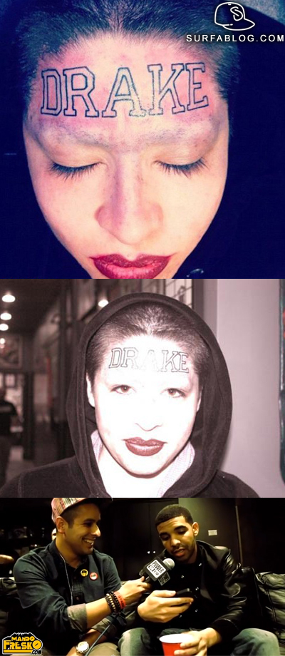 Una ragazza americana si è fatta tatuare sulla fronte il nome di Drake ed il rapper non l'ha presa affatto bene. Dopo aver visto la foto durante un'intervista ha dichiarato "Il ragazzo che ha fatto questo tatuaggio è un f*****o c*****e. A me non piace quel tipo. F*****i per aver fatto questa cosa, perchè sei così un c*****e che dovresti perdere il tuo lavoro. Non dovresti fare più tatuaggi. Non mi piaci c***o e se dovessi mai incontrarti ti faccio il c**o! Vorrei parlare con questa ragazza e capire il motivo di ciò. E' amore, è surreale. Non voglio guardarlo più!"