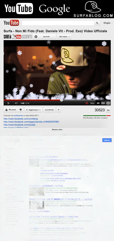Anche Google e YouTube si addobbano per Natale. Basta digitare su Google la frase "let it snow" e inizierà a nevicare durante la vostra ricerca, mentre su YouTube basta cliccare sul fiocco di neve.