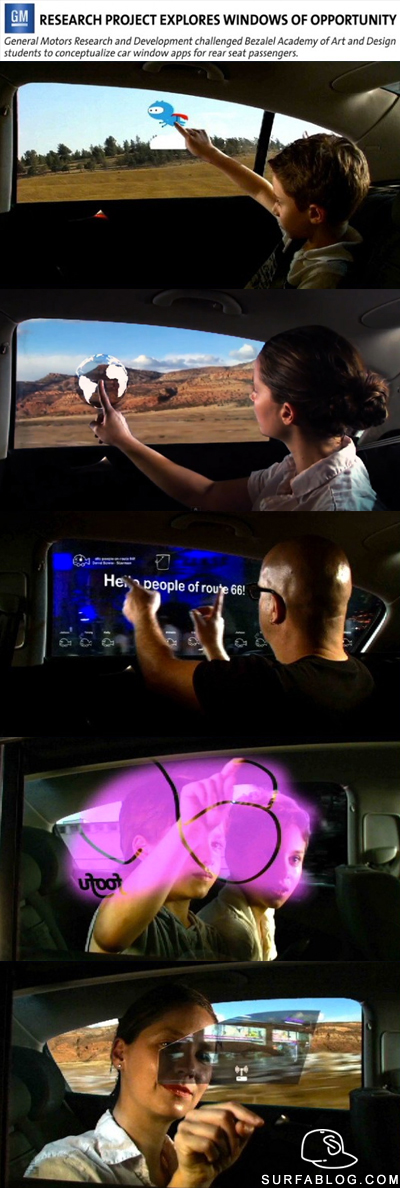 La General Motors sta realizzando il Windows Of Opportunity Project (WOO), ovvero dei nuovi finestrini posteriori tecnologici. Muniti di schermi interattivi, permetteranno di condividere musica, di poter giocare, colorare e di lanciare messaggi agli altri automobilisti. Future!