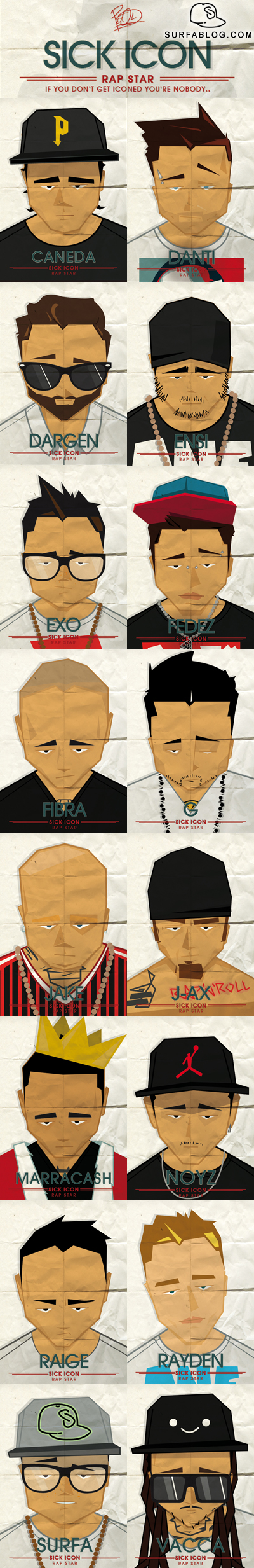 Sick Icon - Rap Star è una raccolta di illustrazioni realizzata da Pool, che rappresenta alcuni esponenti della scena Hip-Hop italiana in maniera iconica, cercando di evidenziare i tratti che caratterizzano ogni artista. Ciascun personaggio viene sintetizzato e riproposto in pochissime linee. In ordine alfabetico e nell'immagine: Caneda, Danti, Dargen, Ensi, Exo, Fedez, Fabri Fibra, Guè Pequeno, Jake La Furia, J-Ax, Marracash, Noyz, Raige, Rayden, Surfa e Vacca.
