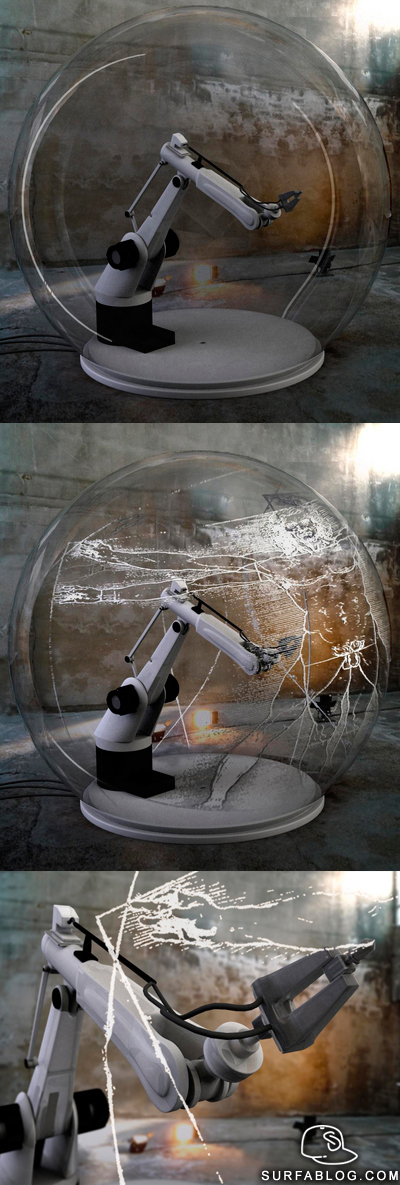 Dal TigreBlog.Com: Ted Noten ha messo sotto una bolla di vetro un semplice braccio meccanico, di quelli che si trovano nelle fabbriche d'auto. Impostando un disegno, in questo caso "L'uomo Vitruviano" di Leonardo, il braccio meccanico, non ha solo disegnato, ma ha graffiato il vetro senza romperlo. Meraviglioso!