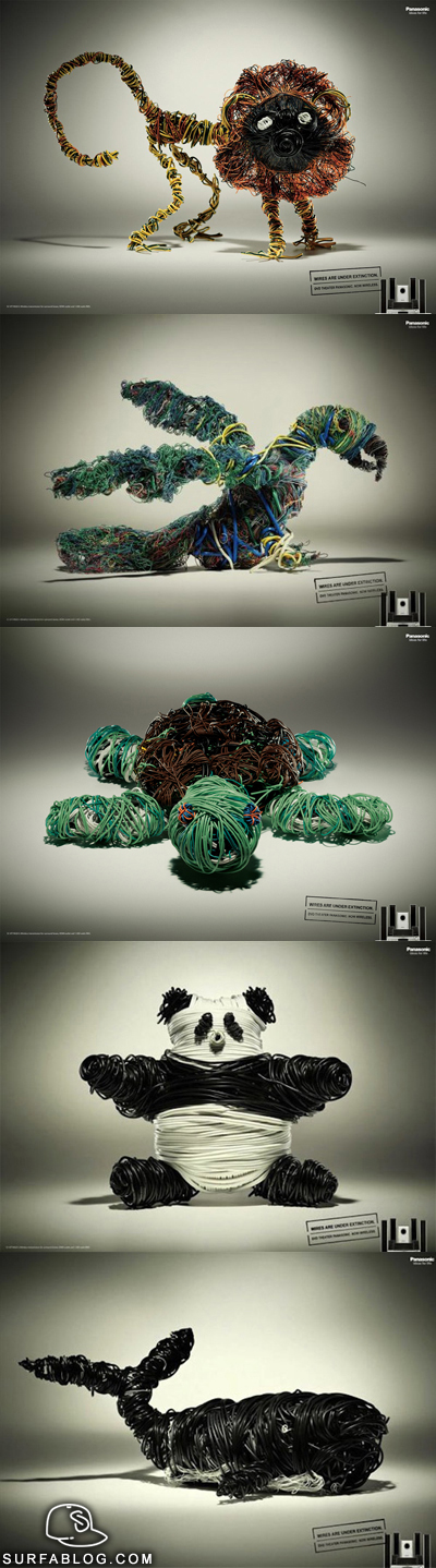 TigreBlog.Com: la Panasonic ha creato questa campagna proprio per sottolineare che i suoi nuovi prodotti non hanno più bisogno dei cavi e che quindi tutti questi "fili" sono in via d'estinzione, come gli animali che vengono qui riproposti.