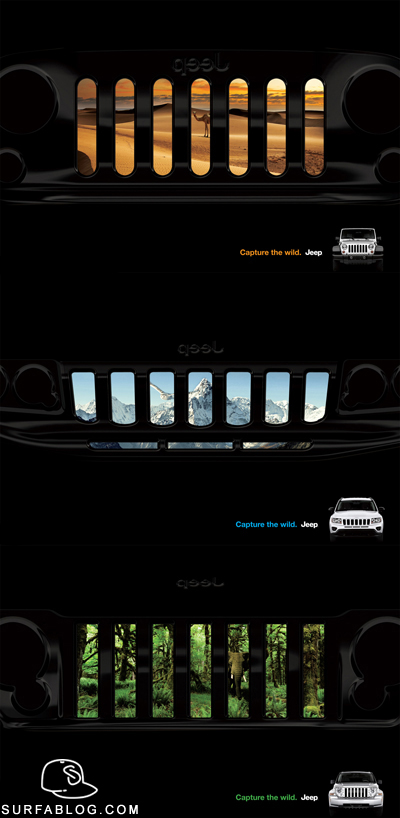 Dal TigreBlog.Com: Sotto queste griglie della Jeep si nascondono foto di pesaggi di NatGeo, che sono stati usati per lanciare la nuova vettura della casa automobilistica. L'idea di base è quella di aver messo in gabbia il lato selvatico della natura. Ad idearla Bodgan Truta e Nicolas Massey.