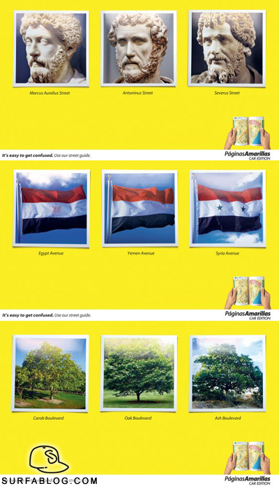 Le Paginas Amarillas sono le pagine gialle spagnole ed eccovi gli spot per promuovere la "car edition" . Nelle pubblicità si vedono 3 immagini molto simili ma che sono 3 oggetti totalmente differenti, che grazie al manuale potrete riconoscere con facilità. Da qui lo spot "It's easy to get confused. Use our street guide".