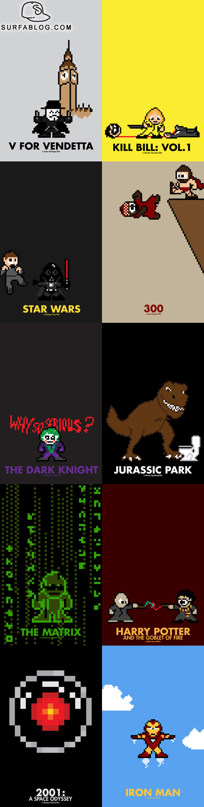 Eccovi alcuni poster in 8-bit di alcuni famosissimi film usciti al cinema. A realizzarli è l'artista americano Eric Palmer. In ordine: V per Vendetta, Kill Bill Vol.1, Star Wars, 300, The Dark Knight, Jurassic Park, The Matrix, Harry Potter, 2011 Odissea Nello Spazio, Iron Man.