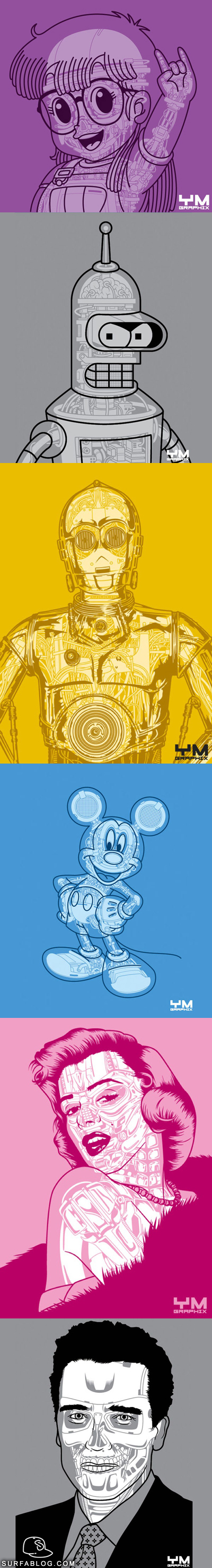 : Yves Malgorn Joe ha disegnato l'anatomia tecnica di famosi personaggi di cartoni animati e film. In ordine: Arale, Bender, C-3PO, Topolino, Marilyn Monroe e Terminator.