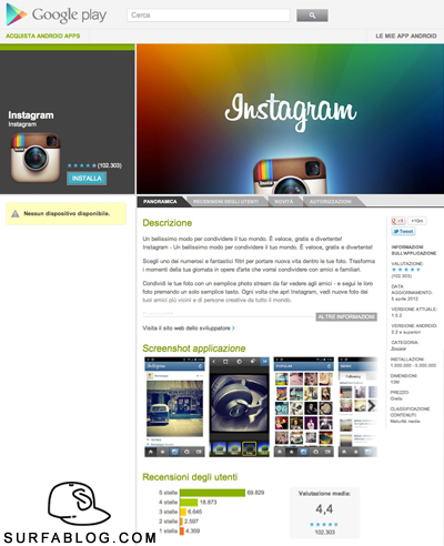 clicca qui), Instagram fa il suo debutto anche sui dispositivi Android. Nel giro di pochi giorni l'app ha raggiunto i 400.000 download sul nuovo sistema con oltre 30 milioni di iscritti totali e più di 1 miliardo di foto caricate.