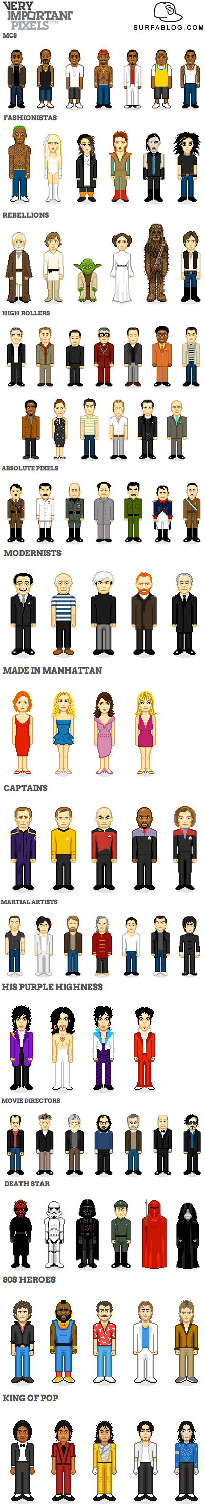 Dal TigreBlog.Com: Kristof Saelen ha realizzato "VIP: Very Important Pixels": i ritratti con i pixel di una serie di personaggi famosi. Li riconoscete tutti? In Ordine: MCS, Fashionistas, Rebellions, High Rollers, Absolute Pixels, Modernists, Made In Manhattan, Captains, Martial Artists, World Leaders, His Purple Highness, Movie Directors, Death Star, 80s Heroes, King Of Pop.