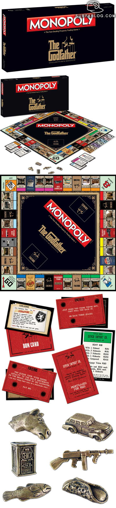 Dopo il Monopoli dell'NBA (per saperne di più clicca qui), il Monopoli di Google Maps (per saperne di più clicca qui), il Monopoli da 2 milioni di $ (per saperne di più clicca qui) e quello di The Wire (per saperne di più clicca qui), ecco un'altra versione degna di nota. Eccovi il Monopoly "The Godfather" dedicato appunto al Padrino di Francis Ford Coppola per il 40esimo anniversario del film. L'edizione speciale vede le 6 pedine tradizionali che hanno la forma di alcuni oggetti leggendari della pellicola come: il cannolo, la limousine, la testa di cavallo, la lattina di Olio Genco, il pesce morto e il mitra. Le "case" e gli "hotel" del gioco originale fanno spazio ai "cantieri" e ai "nascondigli" e le carte "imprevisti" e "probabilità" diventano "amici" e "nemici".