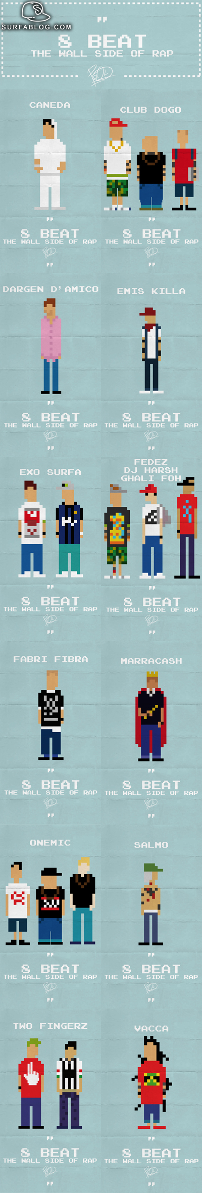 clicca qui), eccovi una nuova raccolta di illustrazioni realizzata da Pool che rappresenta alcuni esponenti della scena Hip-Hop italiana in versione 8 beat. Ogni personaggio viene sintetizzato con la grafica dei vecchi videogame, cercando di evidenziare i tratti che caratterizzano ogni artista. In ordine alfabetico e nell'immagine: Caneda, Club Dogo, Dargen D'Amico, Emis Killa, Exo & Surfa, Fedez Dj Harsh & Ghali Foh, Fabri Fibra, Marracash, One Mic, Salmo, Two Fingerz e Vacca.