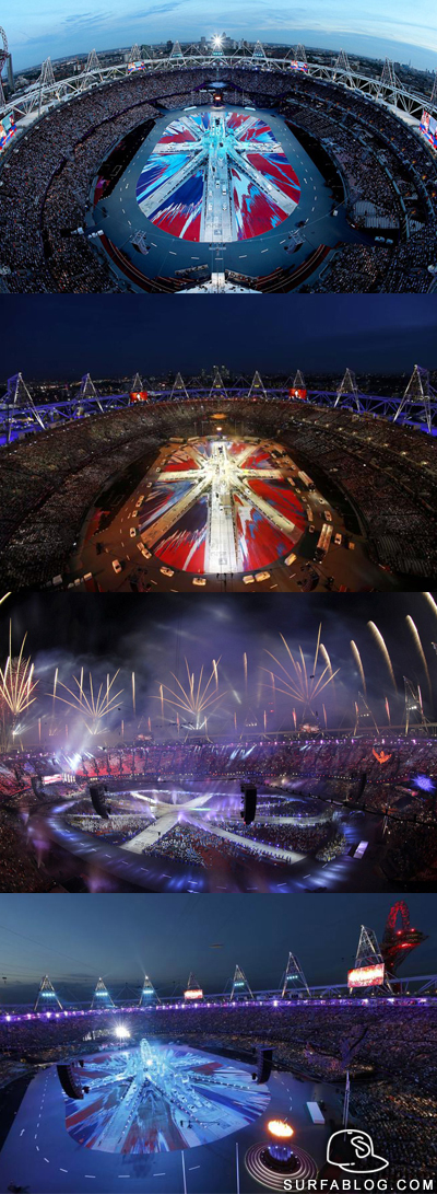 Le Olimpiadi di Londra 2012 si sono concluse con una cerimonia spettacolare. Ha colpito l'attenzione di tutti, l'opera realizzata da Damien Hirst, artista inglese, che ha composto una bandiera del Regno Unito grande quanto tutto il campo da gioco dello stadio. Wow!