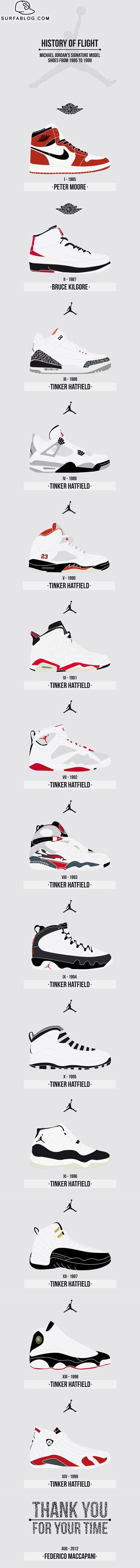 History Of Flight - Air Jordan. Federico Maccapani ha realizzato questo progetto con le illustrazioni di tutte le Jordan uscite dal 1985 al 1999. 14 sneakers totali. Big Macca!