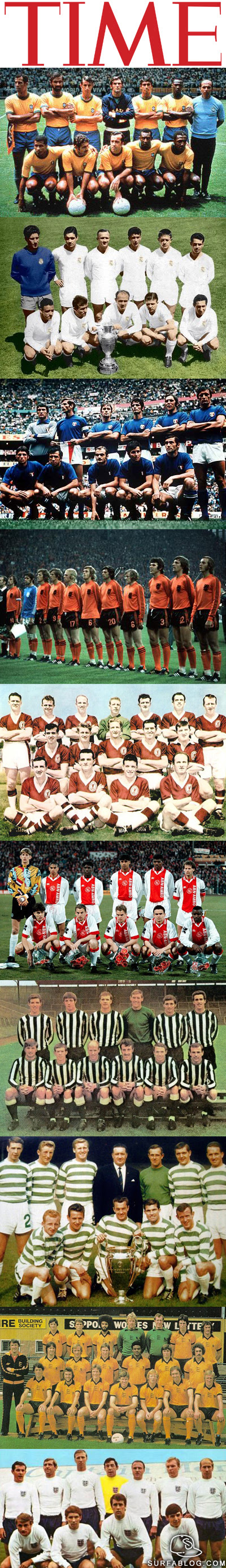 PassioneMaglie.It ho letto che il Time ha realizzato la classifica con le 10 più belle maglie da calcio storiche. Al primo posto la divisa del Brasile del 1970 con i colori: giallo, verde, bianco e blu. Qui di seguito la top 10: